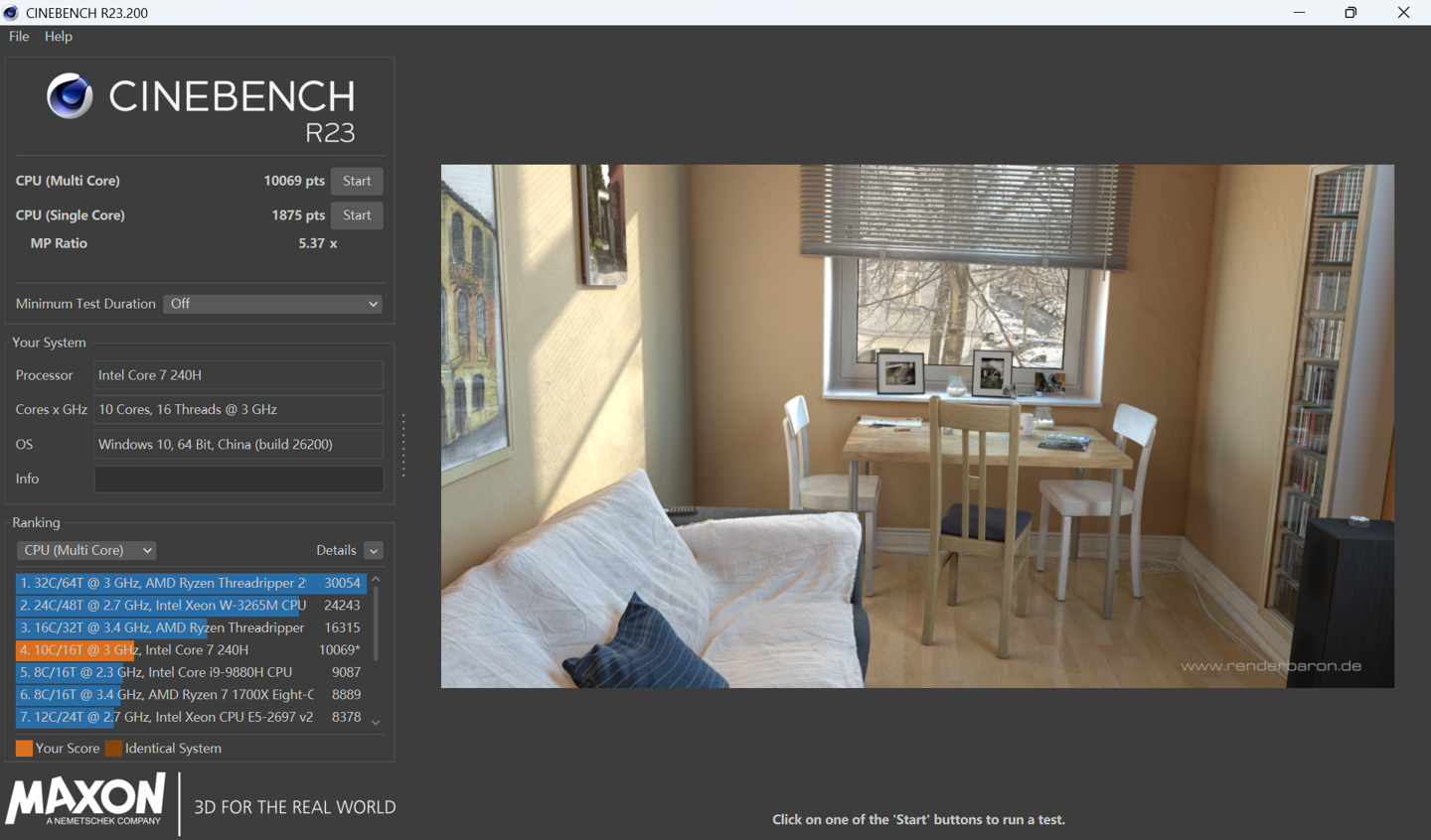 Cinebench R23 单核 / 多核得分:单核 1875 分,多核 10069 分
