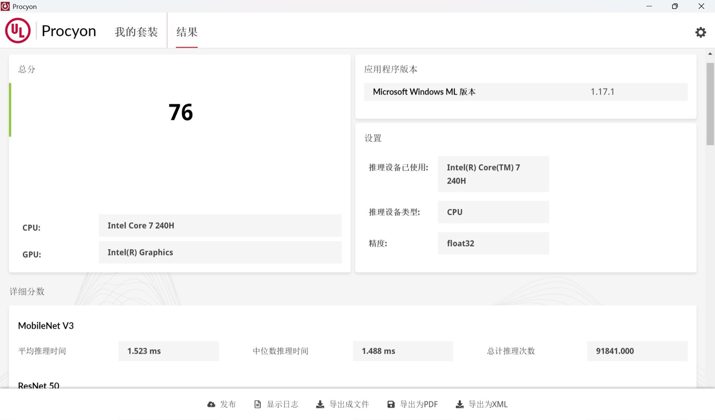 此外,在 2025 年的今天,AI 已经成了许多人生活中的一部分,许多软件也都有了本地运行 AI 推理的需求,在这方面,IT之家使用 UL Procyon 进行了 AI 推理性能测试,综合得分 76 分,这个得分对于一款轻薄本来说还是不错的。