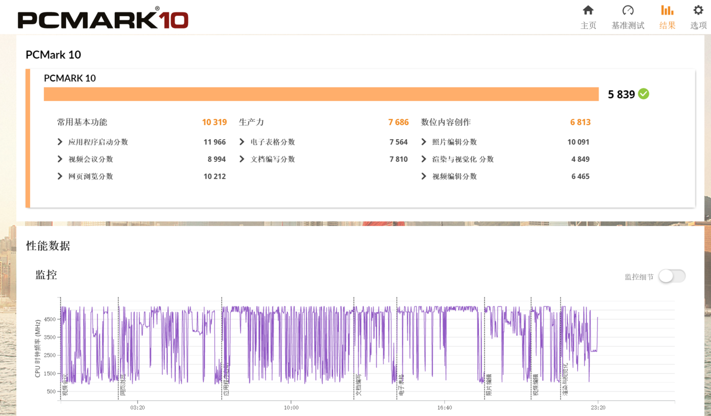 基准跑分终究是理论值,在模拟真实办公场景的综合测试中,PCMark 10 和 CrossMark 能更全面地反映其生产力水平。针对商务人士的使用场景,IT之家进行了 PCMark 10 现代办公测试,综合得分 5839 分。