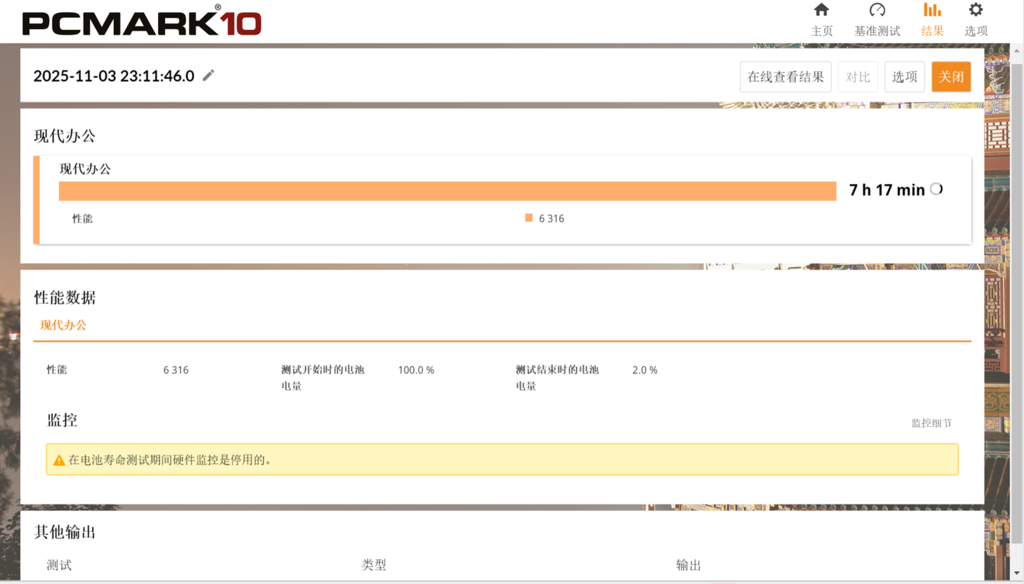 IT之家使用 PCMark 10 进行了现代办公续航测试,在屏幕 50% 亮度、连接 WiFi,关闭蓝牙的条件下,续航成绩达到了 7 小时 17 分钟,结合其标压性能,基本能够满足一天的轻度办公需求。
