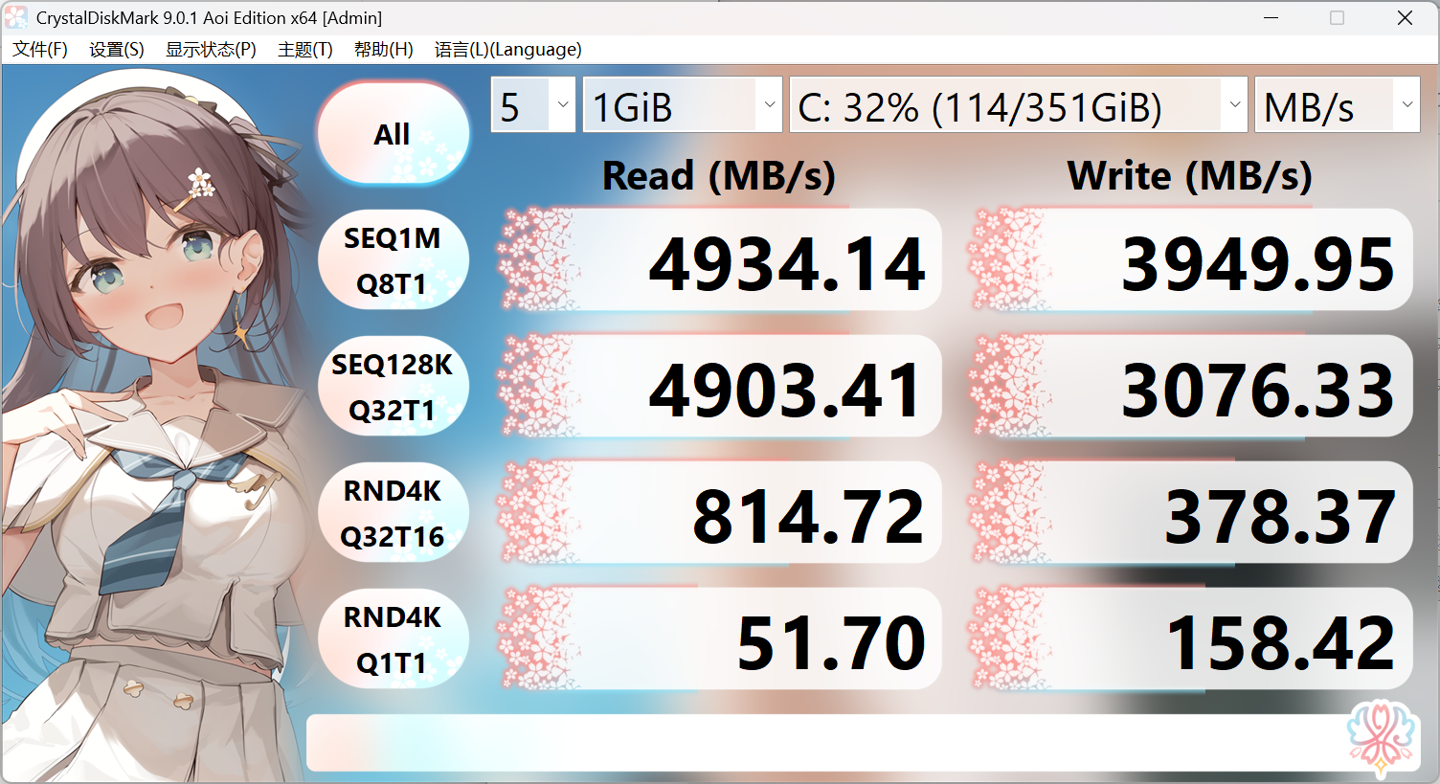 此外,在硬盘方面,CrystalDiskMark 测试中,硬盘 1M 文件连续读取速度接近 5000MB/s,写入速度接近 4000MB/s,高速的读写确保了系统启动、应用加载和大文件传输的流畅。