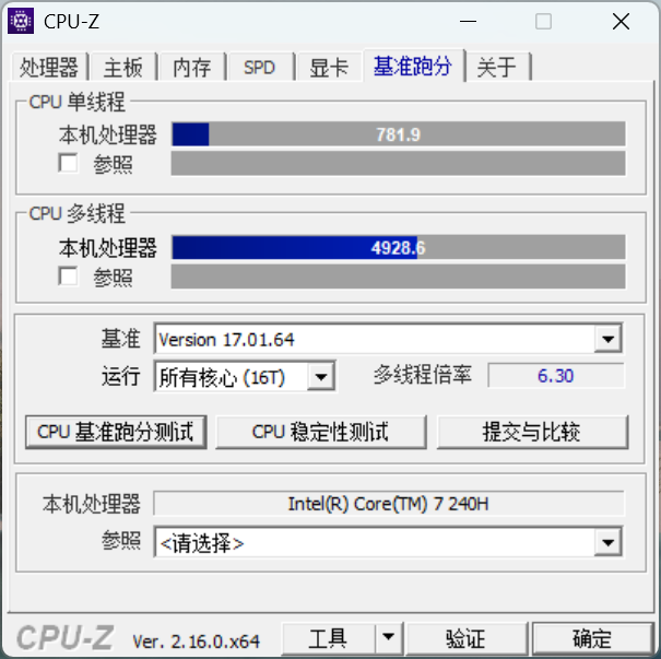 CPU-Z 测试:单核得分 781.9 分,多核得分 4928.6 分