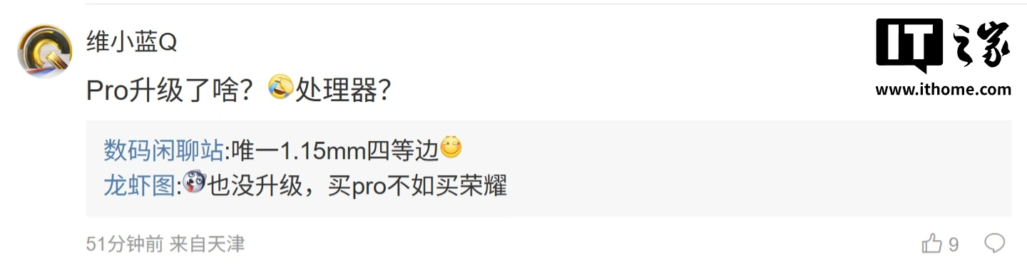 后续有用户在评论区询问:“这波线下机里只有耀子 500 系列电池容量达到 7K 了吗?”,博主回复道:“荣耀已经跨越到 8 了”;另一名用户则询问道:“Pro 升级了啥?处理器?”,博主则回复道:“唯一 1.15mm 四等边”。