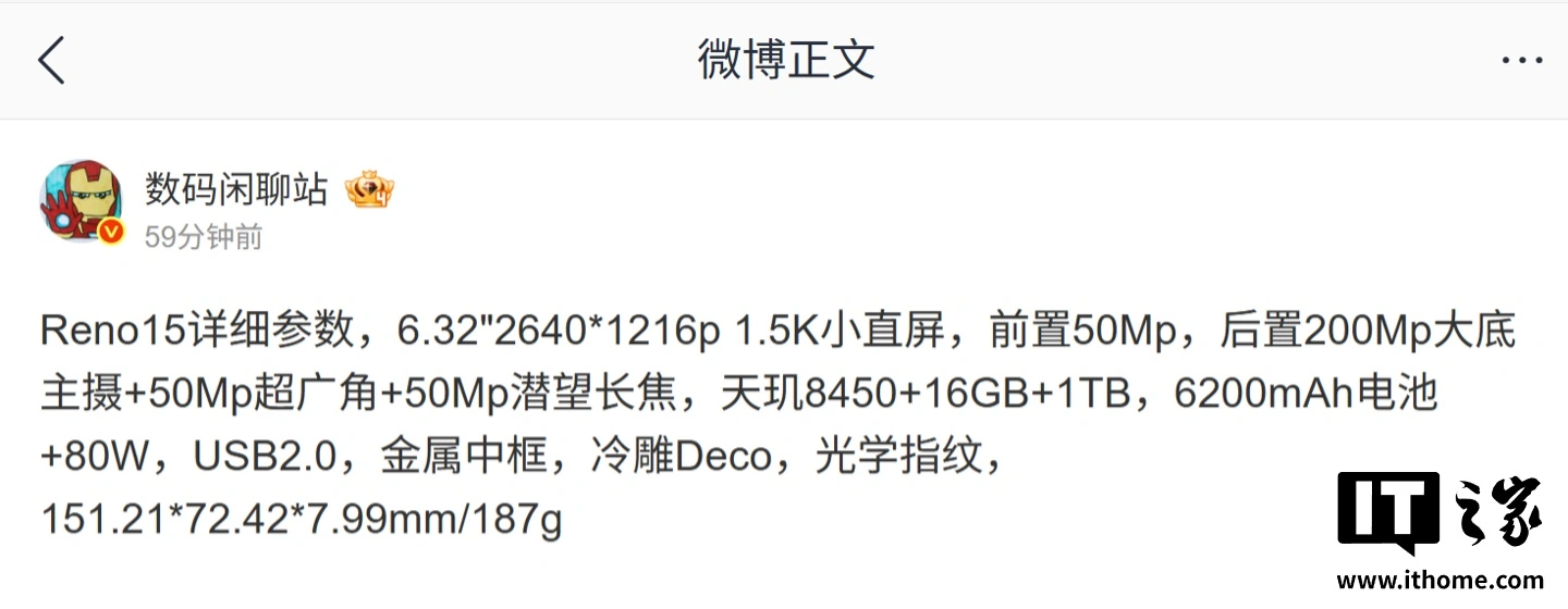 IT之家 11 月 11 日消息,博主 @数码闲聊站 今天在微博透露了 OPPO Reno 15 手机的详细参数,配备 6.32 英寸 1.5K 小直屏。
