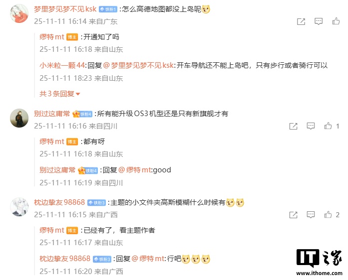博主还在评论区回复了部分网友的问题:针对新动画是所有能升级 OS 3 机型都有,还是只有新旗舰才有,博主回复称:“都有呀。”针对主题的小文件夹高斯模糊什么时候有,博主表示:“已经有了,看主题作者。”