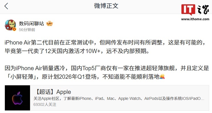IT之家 11 月 11 日消息,博主 @数码闲聊站 今日发文透露,iPhone Air 2 目前在正常测试中,但网传发布时间有所调整,这是有可能的,毕竟第一代卖了 12 天国内激活才 10W+(即 10 万+),远不及内部预期。