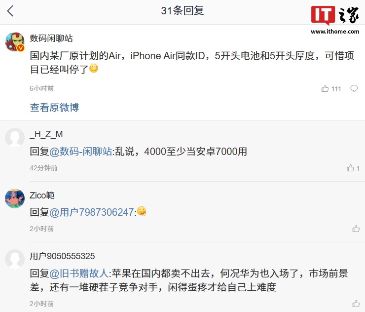 IT之家注意到,博主随后在评论区补充称:“国内某厂原计划的 Air,iPhone Air 同款 ID,5 开头电池和 5 开头厚度,可惜项目已经叫停了。”