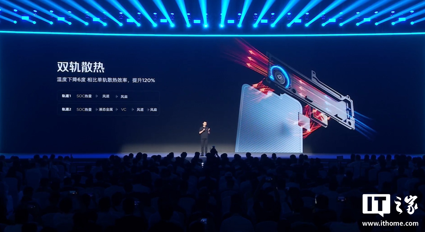 同时这款手机还拥有“双轨散热”,可将 SOC 产生的热量“兵分两路”,分别直接散热至风道 / 风扇、液金 / VC / 风道 / 风扇,相比单轨散热效率提升 120%,温度下降 6℃,整套系统名为“ICE 魔冷散热系统”,号称“最强散热风向标”。