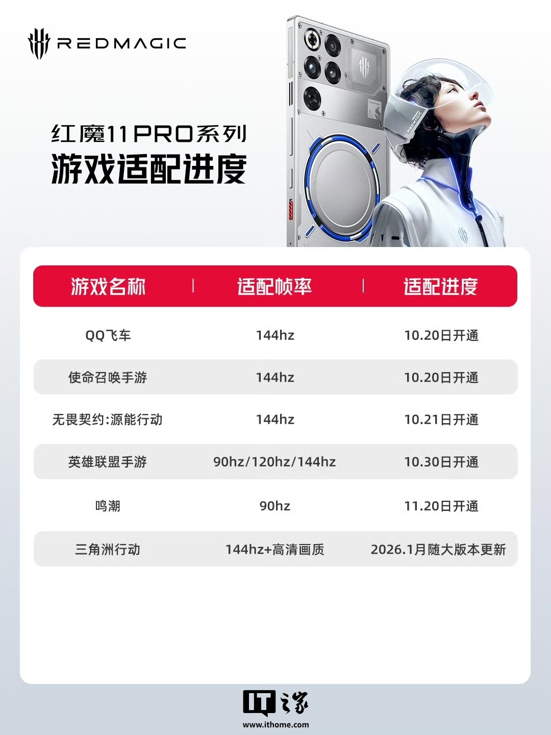 参考IT之家此前报道,红魔游戏手机官方在 10 月 20 日公布了红魔 11 Pro 系列游戏适配进度,涵盖《QQ 飞车》《使命召唤手游》等多款手游。