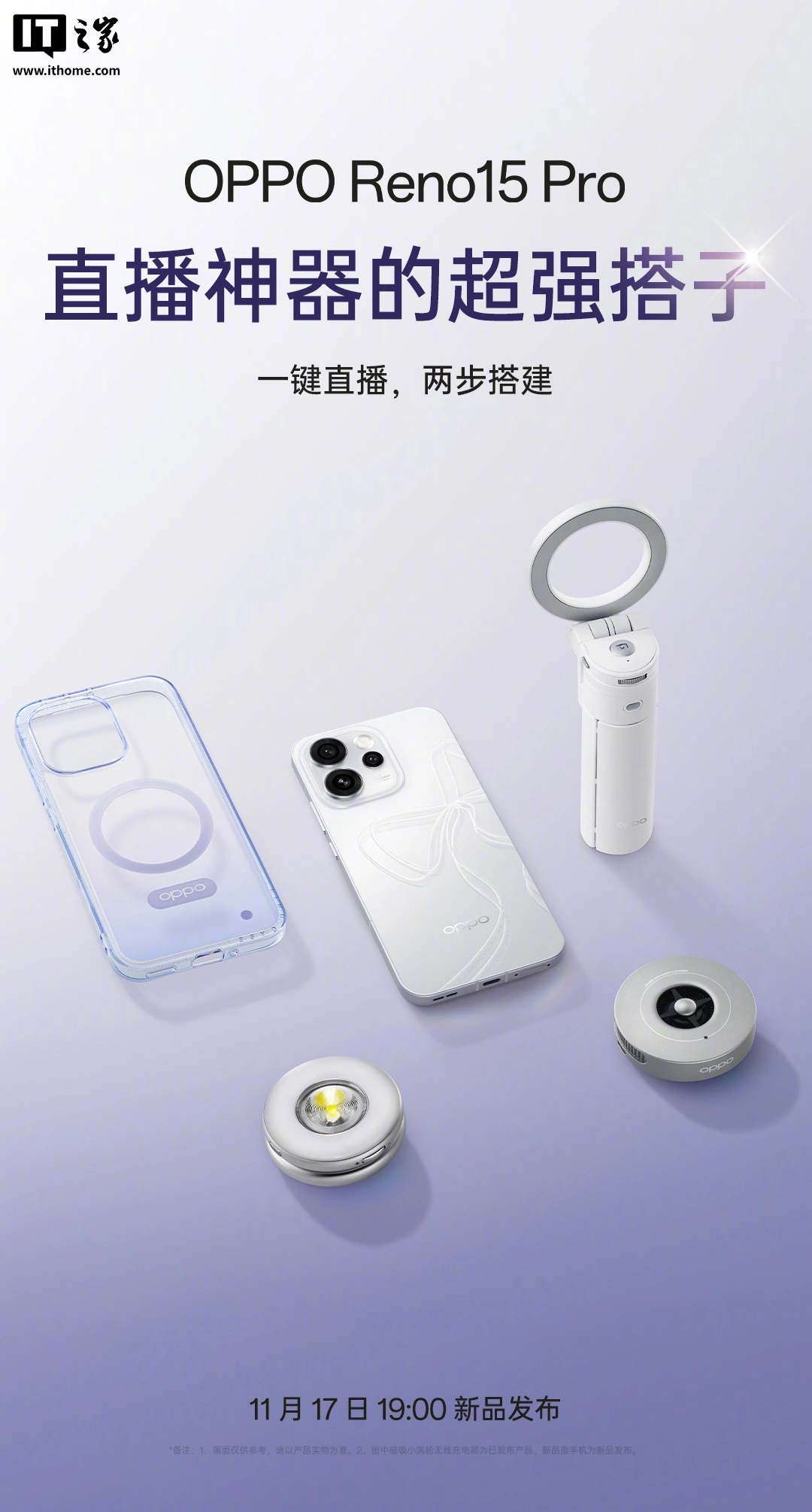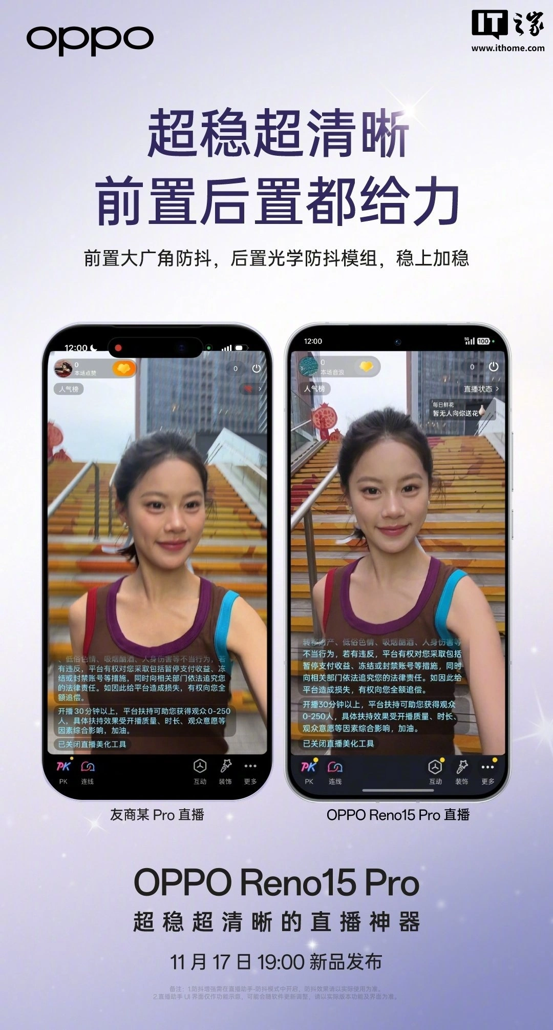 IT之家 11 月 13 日消息,OPPO Reno15 系列手机已官宣 11 月 17 日 19:00 新品发布,根据官方预热,Reno15 Pro 定位“直播神器”,主打“超稳超清晰”特性。