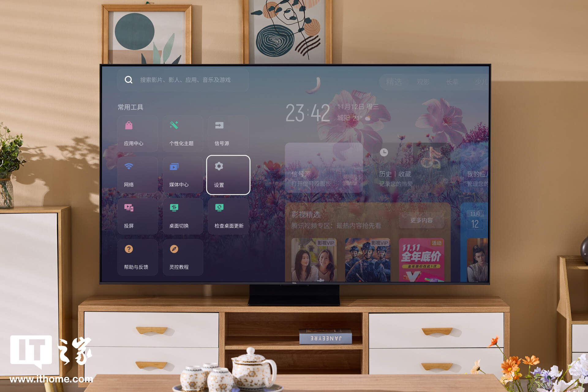 同时,灵控系统 3.0 还支持卡片式自定义桌面,可以像搭乐高一样设置自己的桌面,常用的应用、功能卡片一目了然。遥控器上还有 3 个自定义快捷键,可以做到功能、应用的“一键直达”。
