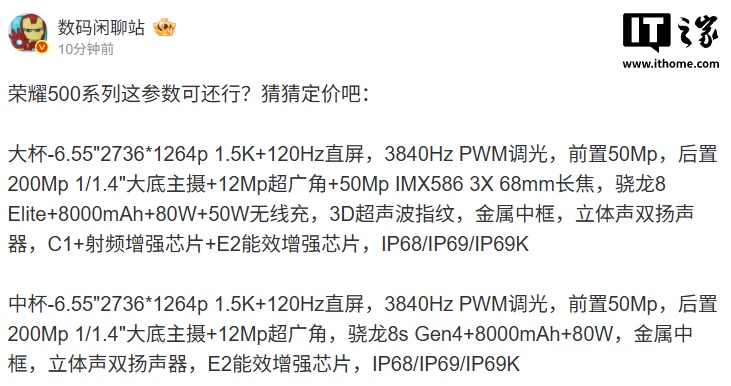 IT之家 11 月 17 日消息,今日早些时候,荣耀 500 系列新品发布会官宣定档 11 月 24 日 19:30,代言人为肖战。博主 @数码闲聊站 现已曝光两款新机的主要参数。