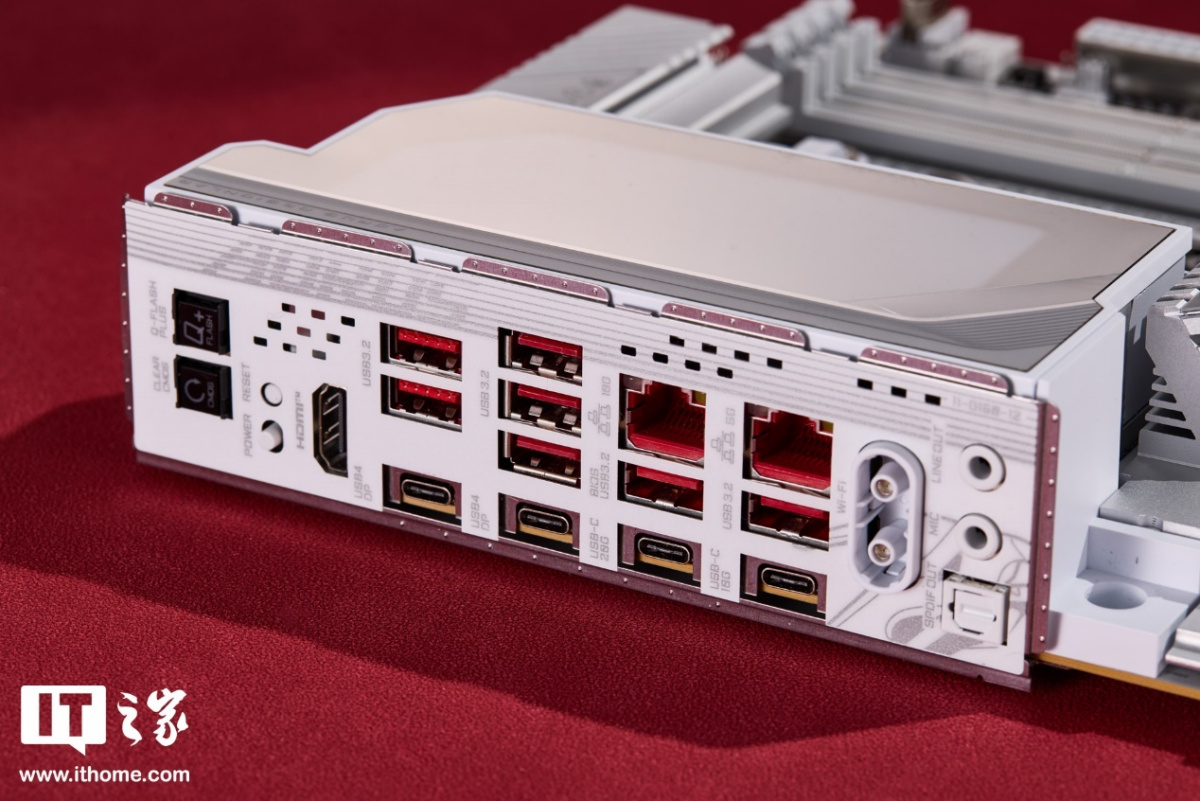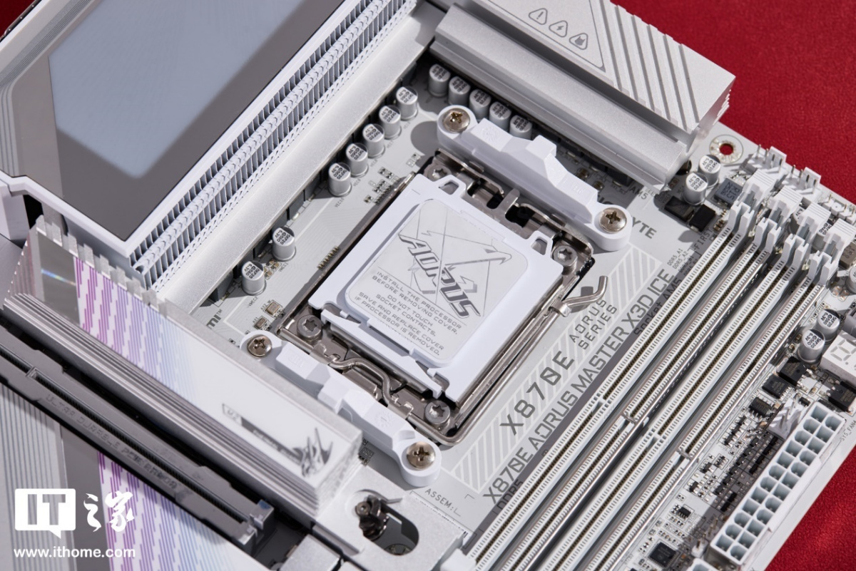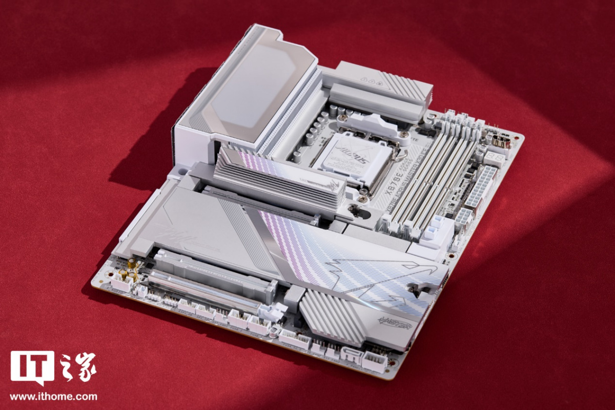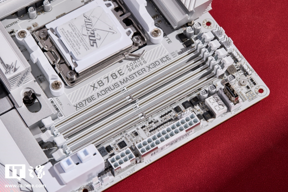 技嘉超级冰雕 X870E X3D 主板采用纯白 PCB 和银色金属散热装甲,几乎所有 PCB 上的元器件都做了白色喷涂,包括内存和 PCIe 插槽、CPU 扣具座、接口外壳以及数显灯和按键,视觉一体感极强,风格简约大气。