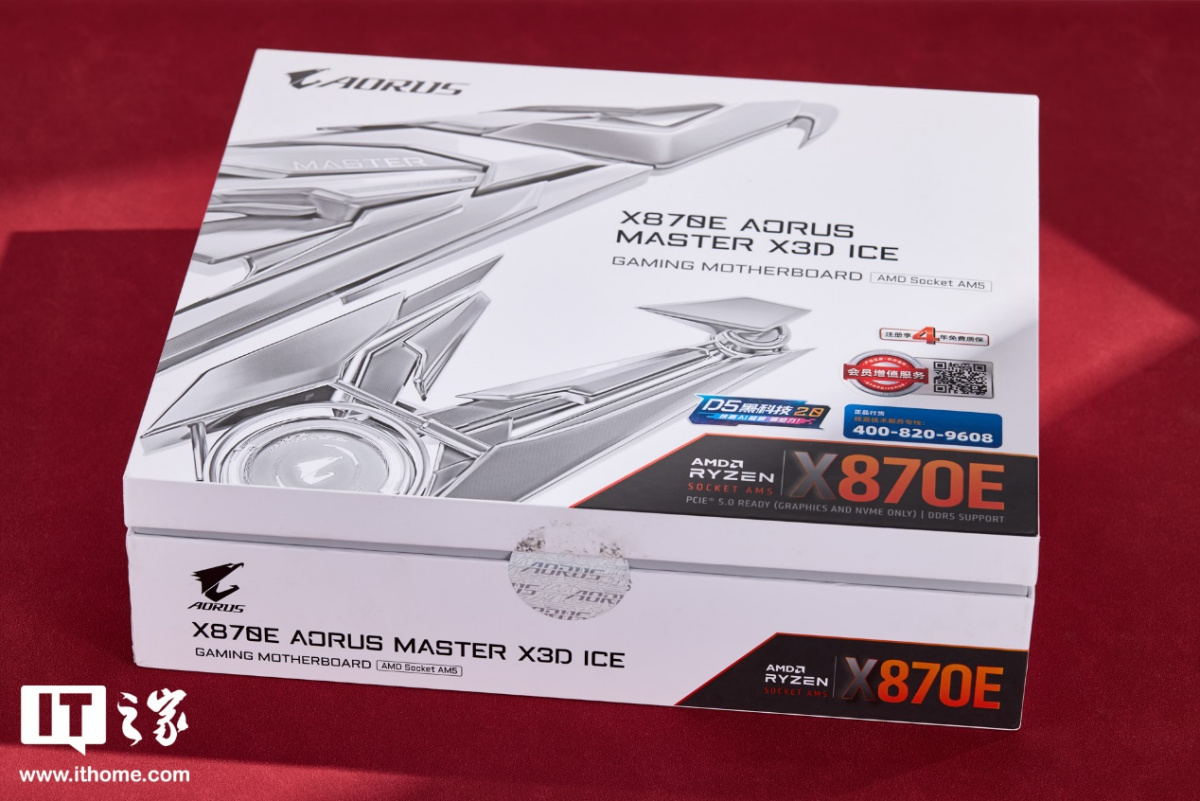 IT之家已经拿到了这款旗舰定位的主板新品,接下来就给大家带来开箱图赏。技嘉超级冰雕 X870E X3D 主板采用定制白色天地盖包装,包装正面印有金属质感的大雕图案,X870E 型号、D5 内存黑科技 2.0 核心卖点以及 4 年保修服务相关信息。