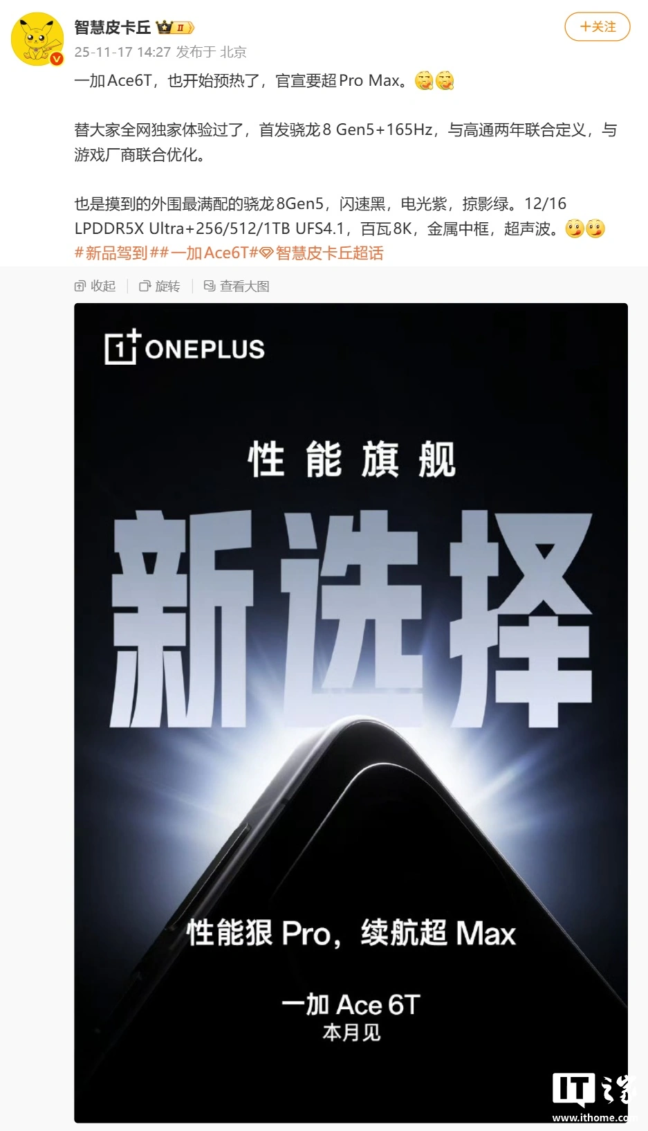 IT之家 11 月 18 日消息,一加 Ace 6T 手机将于本月发布,号称「性能旗舰新选择」,全球首发搭载高通年度旗舰芯片 —— 第五代骁龙 8,搭载风驰游戏内核,配备 8000 毫安时以上电池。
