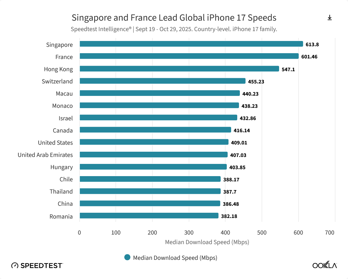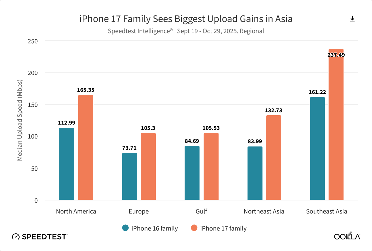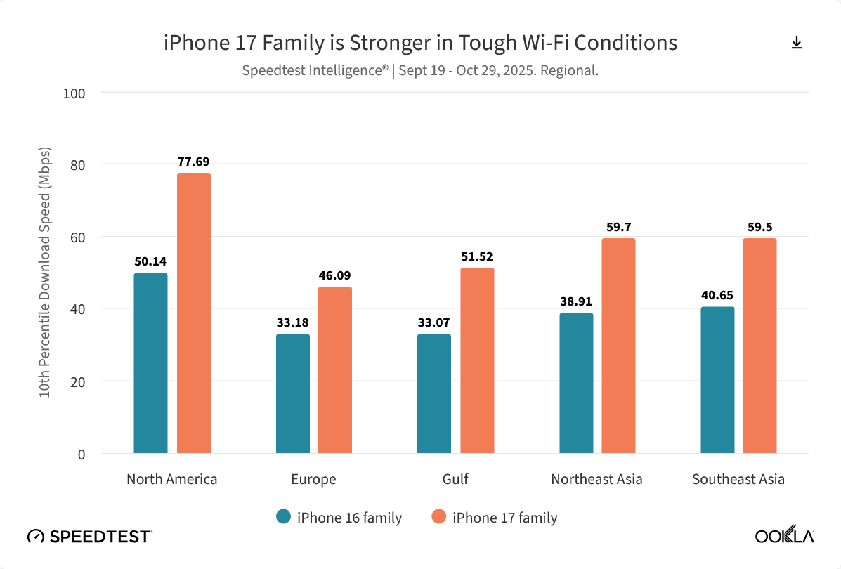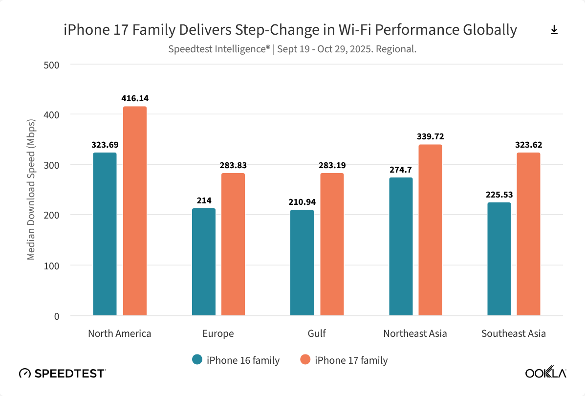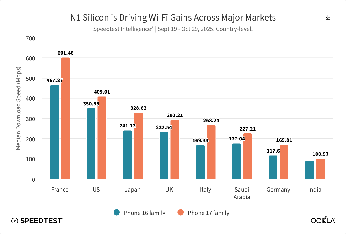 IT之家 11 月 18 日消息,测速机构 Ookla 昨日(11 月 17 日)发布最新《Speedtest Intelligence》报告,指出 2025 年成为 Wi-Fi 技术竞争的关键年份,苹果公司正式在 iPhone 17 系列中推出其首款自研无线网络芯片 N1,相比较 iPhone 16 系列,全球上传和下载中位数增幅均达到 40%。
