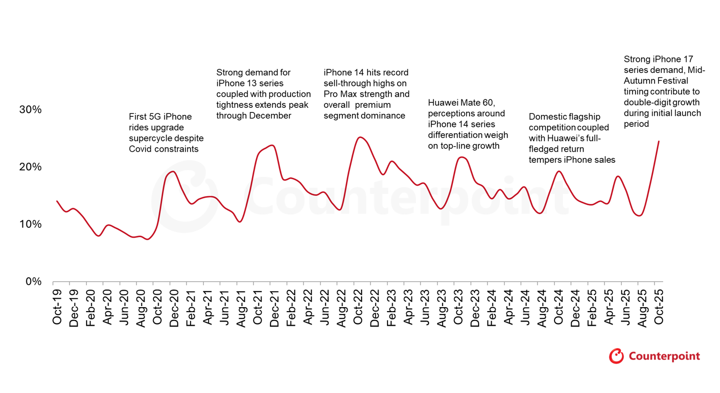 文章来源于互联网:CounterPoint:苹果 iPhone 17 系列 10 月中国销量同比猛增 37%、份额飙至 25%