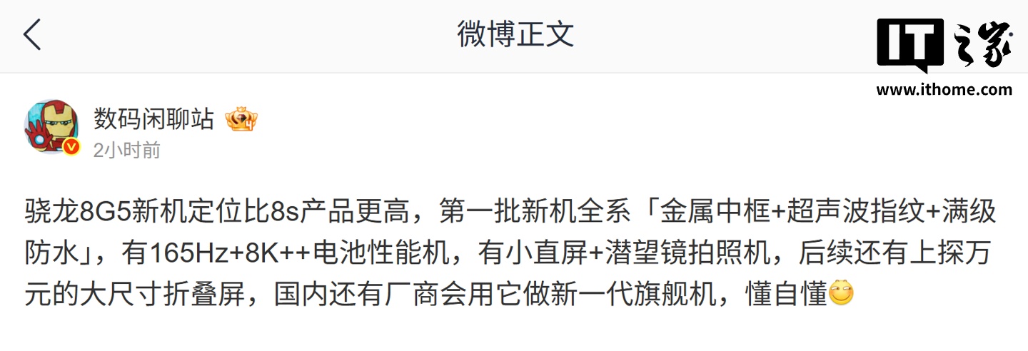 IT之家 11 月 20 日消息,博主 @数码闲聊站 今天在微博透露,多款骁龙 8 Gen 5 芯片新机定位相比 8s 产品更高。
