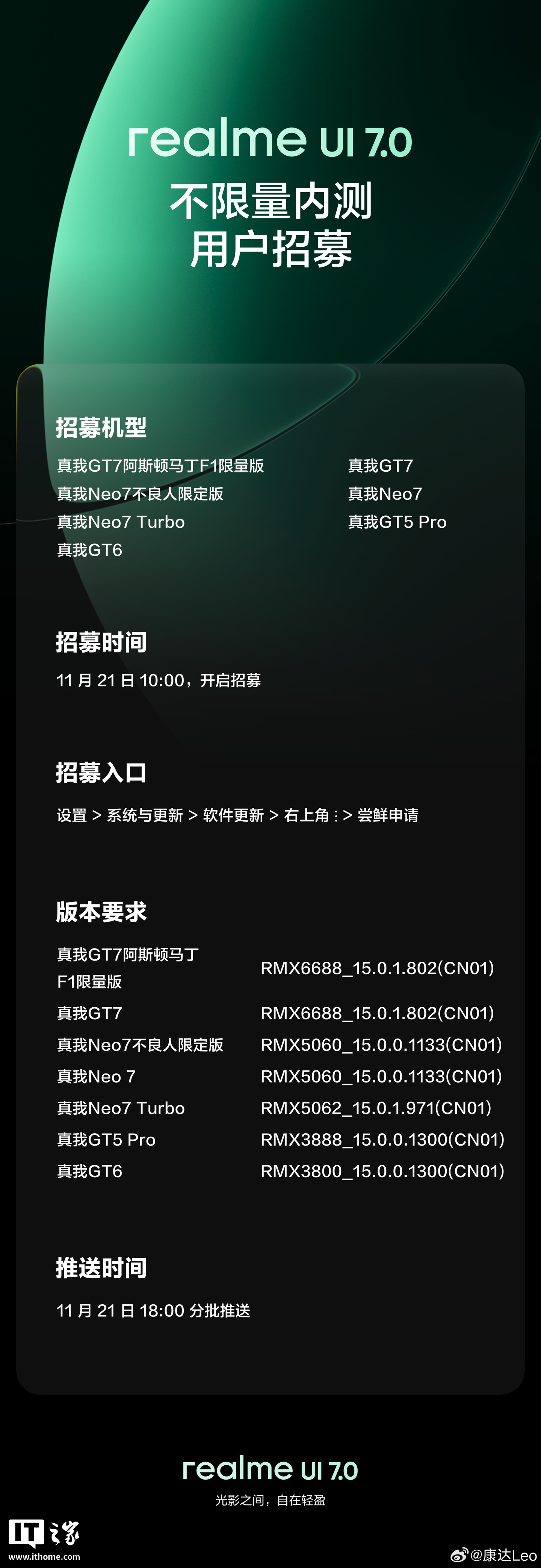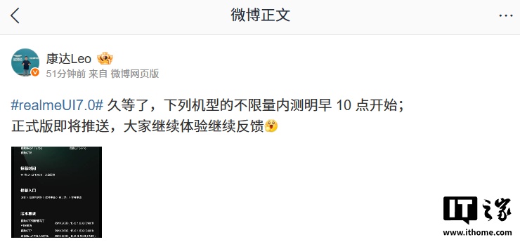 IT之家 11 月 20 日消息,realme UI 产品经理 @康达Leo 刚刚宣布,真我 GT7、Neo7 等系列机型将在明早 10 点开启 realme UI 7.0 系统的不限量内测。他还表示,realme UI 7.0 正式版也即将推送。