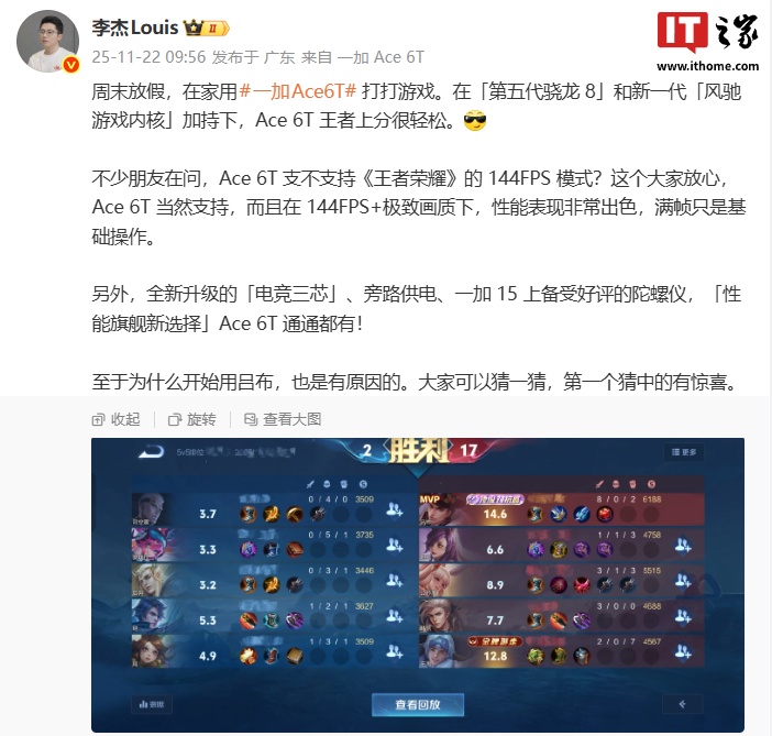 IT之家注意到,一加中国区总裁李杰昨日发文透露,一加 Ace 6T 手机搭载第五代骁龙 8 处理器、内置新一代「风驰游戏内核」,并确认支持《王者荣耀》144FPS 模式。他表示,新机在 144FPS + 极致画质下,性能表现非常出色,满帧只是基础操作。