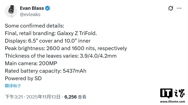 11 月 13 日,知名爆料人 Evan Blass 透露,三星即将推出的三折新机将正式命名为 Galaxy Z TriFold。该机配备一块 6.5 英寸外屏,峰值亮度高达 2600 尼特,无需展开即可提供常规智能手机的使用体验;而展开后则是一块 10 英寸巨幕内屏,使设备瞬间化身便携式平板电脑。据称,内屏峰值亮度为 1600 尼特。