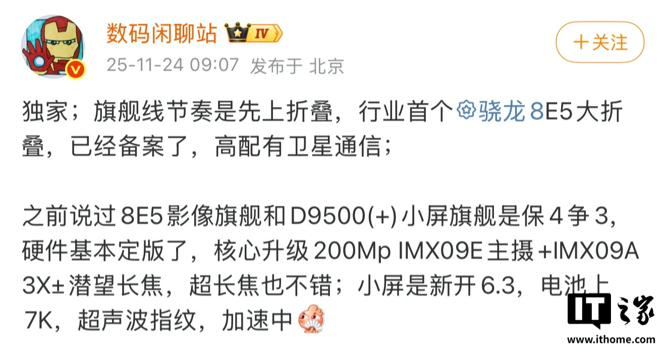 该博主还爆料,第五代骁龙 8 至尊版影像旗舰和 D9500 (+) 小屏旗舰是“保 4 争 3”,硬件基本定版了,核心升级 200Mp IMX09E 主摄 +IMX09A 3X± 潜望长焦,超长焦也不错;小屏是新开 6.3 英寸,电池上 7000mAh,搭载超声波指纹。