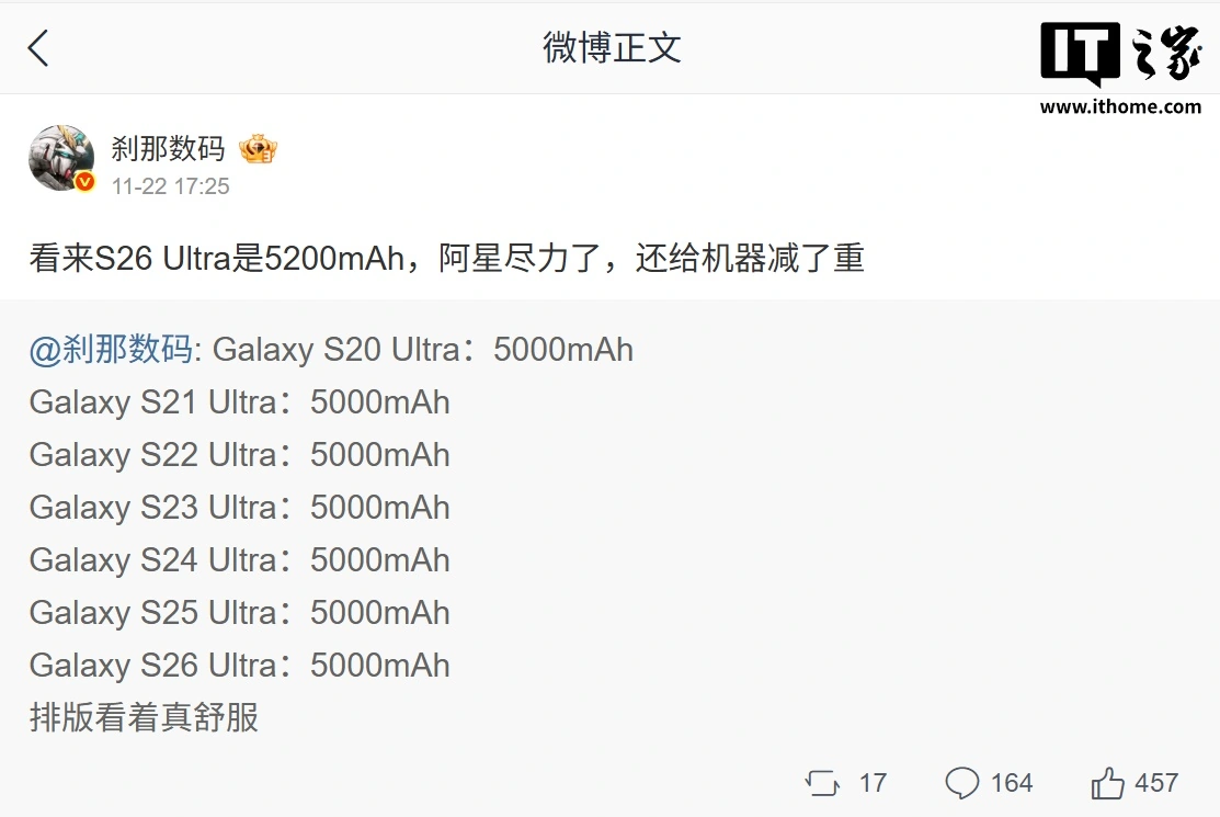 IT之家 11 月 24 日消息,博主 @刹那数码 今天在微博发文称,三星 Galaxy S26 Ultra 手机将搭载 5200mAh 电池,机身重量有所减轻。