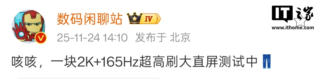 IT之家 11 月 24 日消息,博主 @数码闲聊站 今日爆料,某厂一块 2K+165Hz 超高刷大直屏测试中。结合该博主此前的爆料习惯,预计为 iQOO 手机。
