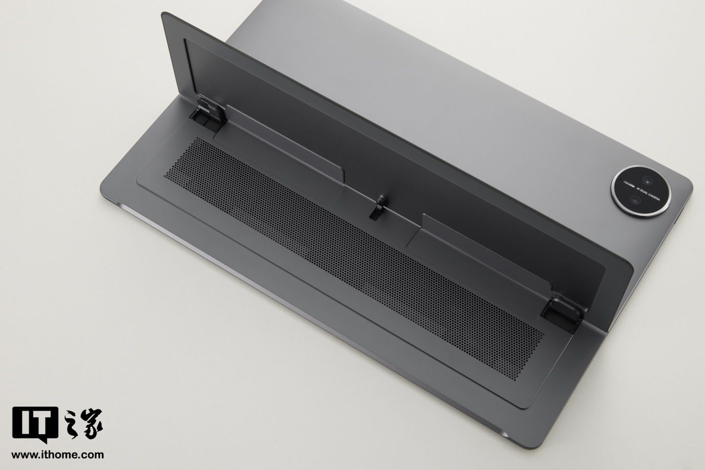机身侧面,独特的“贯穿式出风腰线”引起了我们的注意。这是华为 MatePad Edge 创新散热架构的外显特征,近 4000 个风孔巧妙地融入机身线条之中,既保证了双风扇、双 VC 的散热效率,又没有破坏整体的简约美感。