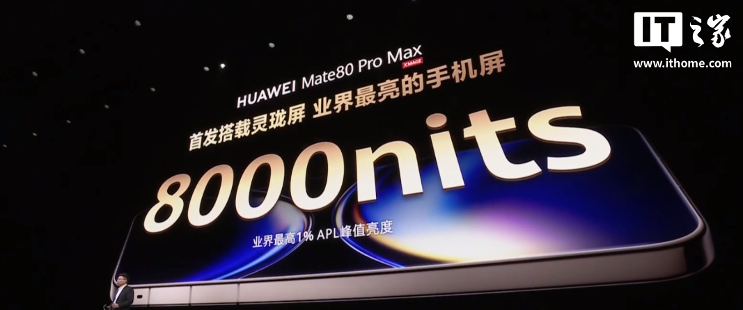 IT之家 11 月 25 日消息,华为 Mate 80 系列手机今日正式发布,其中的 Mate 80 Pro Max 首发搭载灵珑屏,实现 1% 窗口局部激发亮度 8000nits,宣称是“业界最亮的手机屏”。