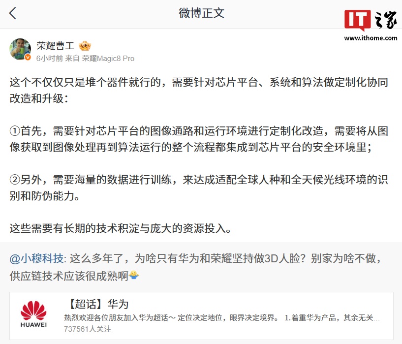 IT之家 11 月 26 日消息,博主 @小穆科技 询问:“这么多年了,为啥只有华为和荣耀坚持做 3D 人脸?别家为啥不做,供应链技术应该很成熟啊。”荣耀研发工程师 @荣耀曹工 今日发文解答了这一问题。