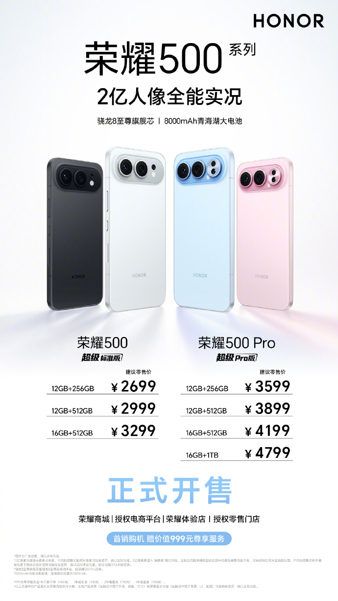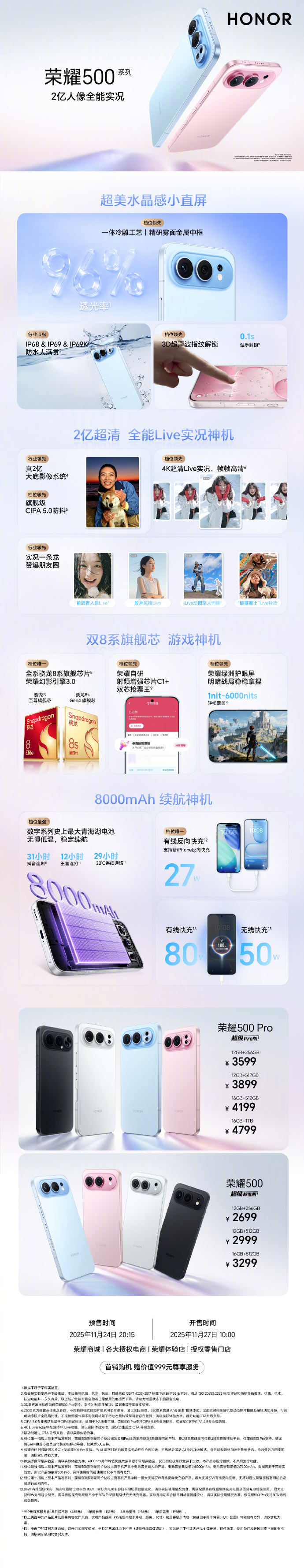 IT之家 11 月 27 日消息,全新荣耀 500 系列手机今日 10:00 正式开售,全系一体冷雕工艺、2 亿人像全能实况、骁龙 8 系旗舰芯片、8000mAh 青海湖电池,售价 2699 元起。