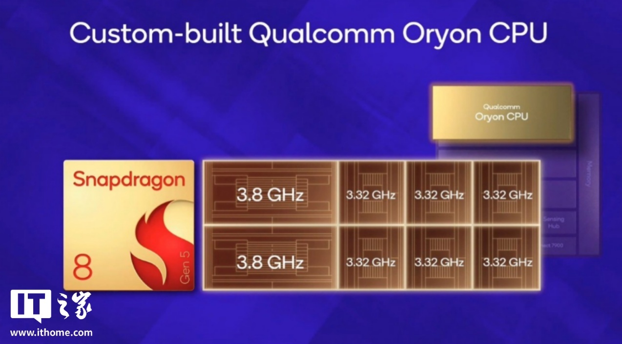 据IT之家昨日报道,高通骁龙 8 Gen 5 处理器现已正式发布,配备第三代 Oryon CPU,包括 2 个主频为 3.8 GHz 的 prime 核心和 6 个 3.32GHz 的性能核心,相比两年前的骁龙 8 Gen 3 在 CPU 任务上有 36% 提升,GPU 提升 11%,AI 任务提升 46%。