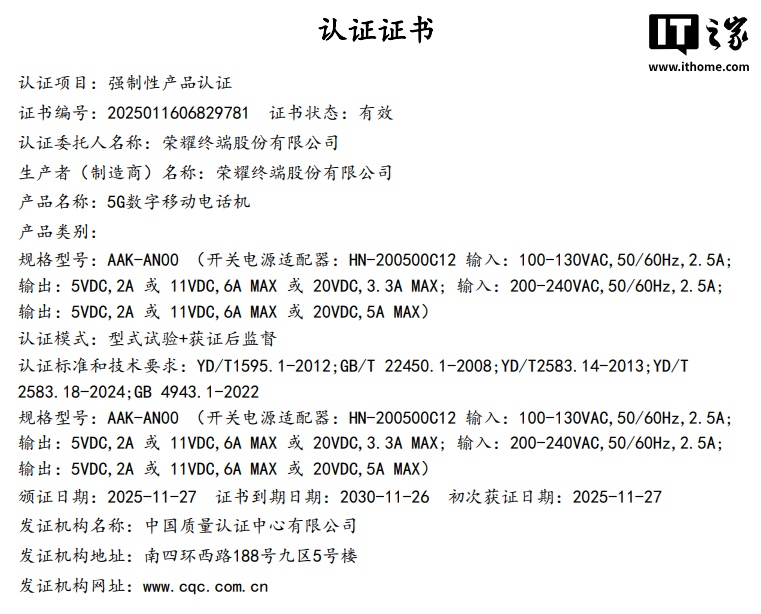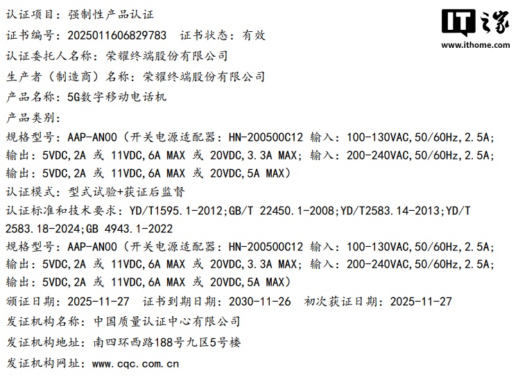IT之家 11 月 28 日消息,型号为 AAK-AN00、AAP-AN00 的荣耀新机昨日通过 3C 质量认证,经 @数码闲聊站 确认为荣耀 GT2 系列。