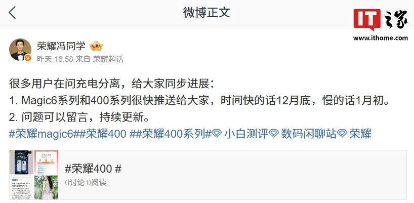 IT之家 11 月 29 日消息,荣耀游戏研发工程师 @荣耀冯同学 昨日发文透露,荣耀 Magic6 / 400 系列手机的「充电分离」功能预计 12 月底或 1 月初推送升级