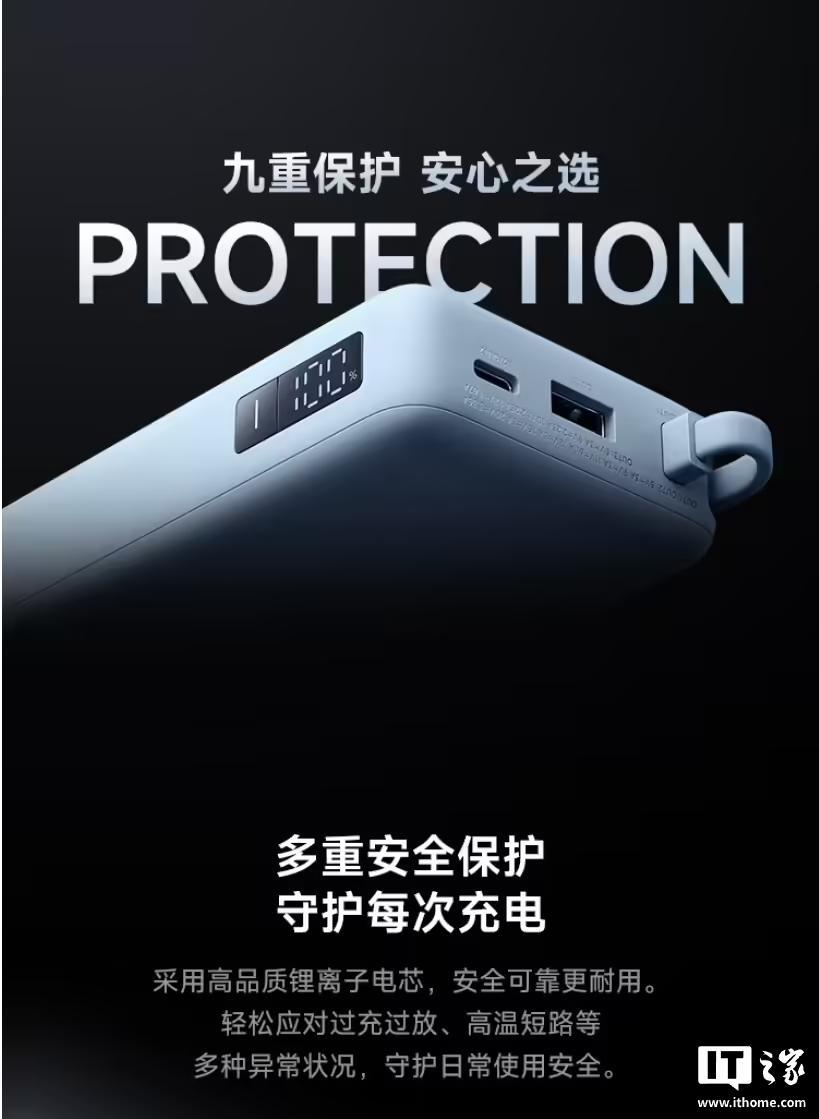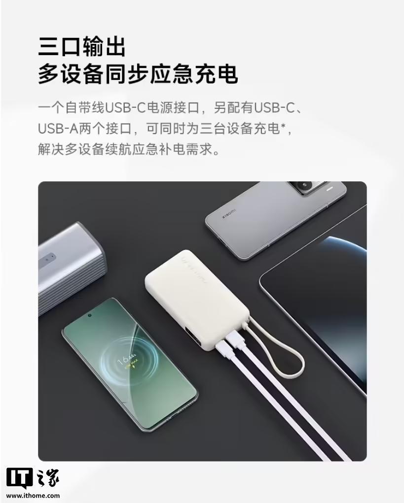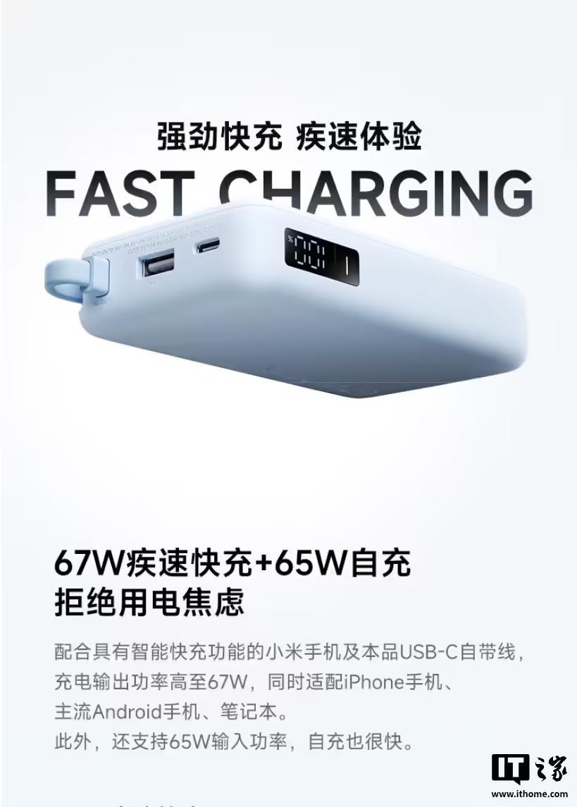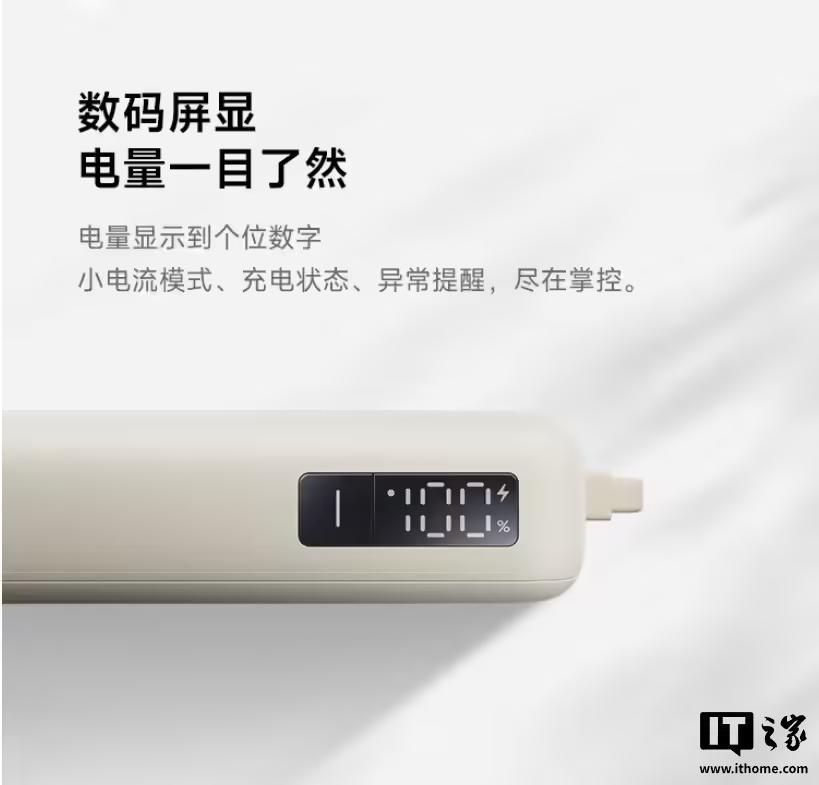 IT之家 8 月 7 日消息,小米自带线充电宝 10000 67W 现已上市,自带 USB-C 充电线及数码屏显,可一键直观查看电池容量,预售价 149 元。