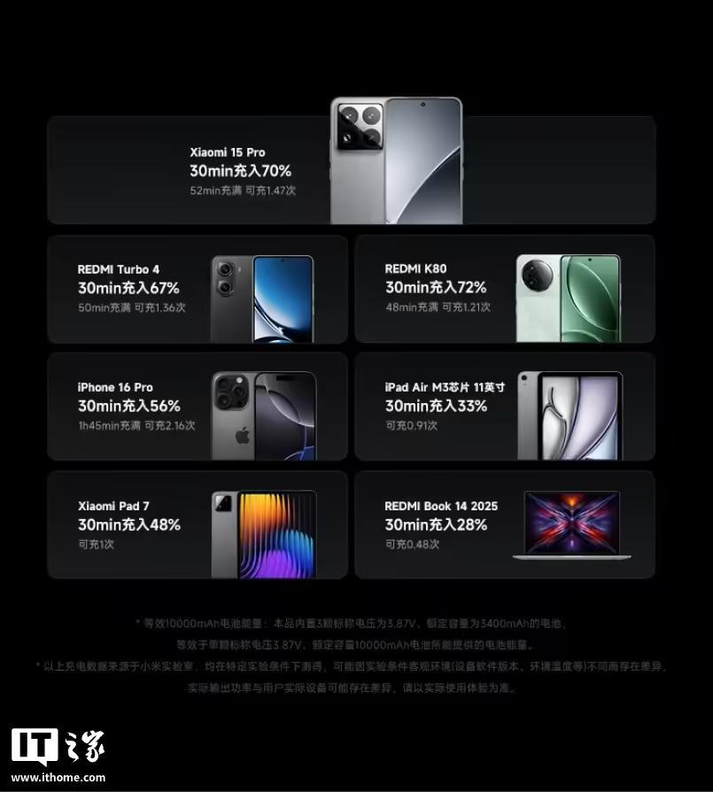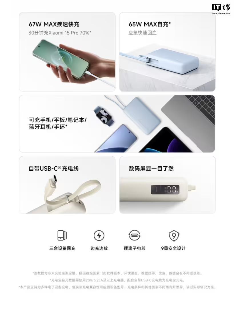 据小米介绍,这款充电宝通过了 3C 认证,可带上飞机,最高支持 67W 快充,30 分钟内可将小米 15 Pro 手机充至 70% 的电量;同时支持 65W 自充,可在 1.3 小时内充满,号称比老品提速 36%(小米实验室数据)。