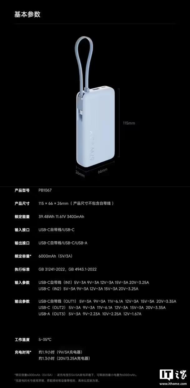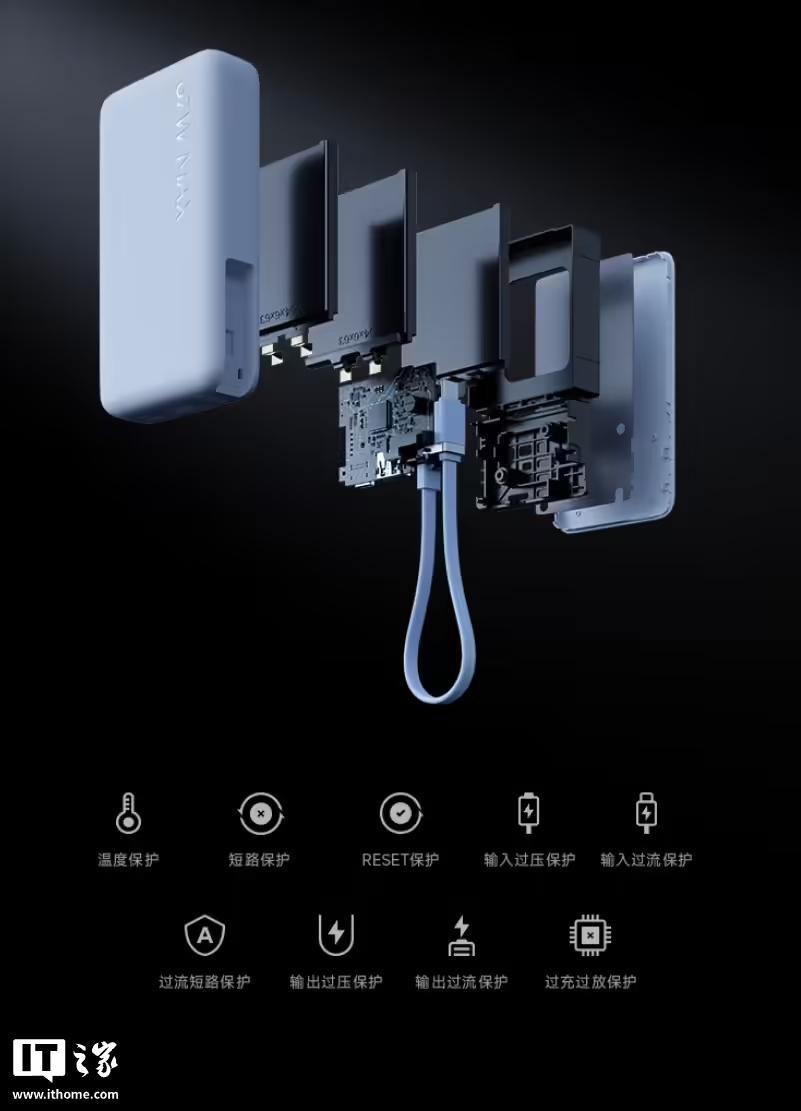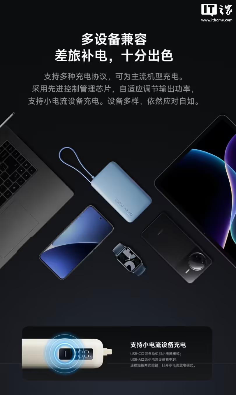 硬件方面,这款充电宝内置 3 颗 3400mAh 电芯,等效 10000mAh 电池能量,可满足日常基础用电需求,支持多种主流充电协议,可为电脑、手机、平板等设备充电,支持小电流模式,可安全为手环、耳机等设备补能。