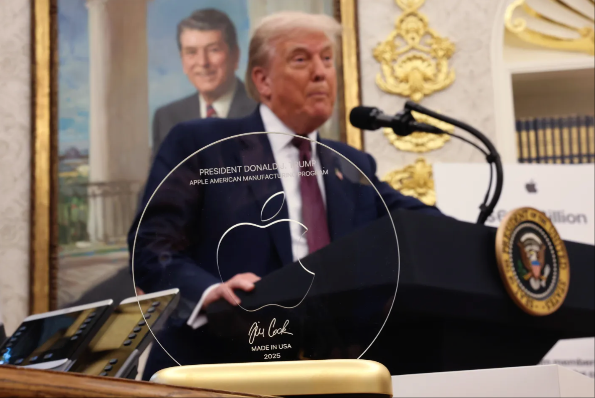 凤凰网科技讯 北京时间8月7日,据科技网站TheVerge报道,美国总统特朗普周三在白宫举行新闻发布会,介绍了苹果公司的新美国制造计划。在这场活动上,苹果CEO蒂姆·库克(Tim Cook)向特朗普赠送了一份礼物:一个由iPhone玻璃制造商康宁公司打造的“独特”玻璃艺术品,这块玻璃镶嵌在一个24K黄金底座上。