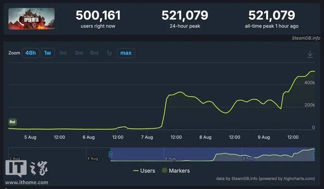 IT之家 8 月 10 日消息,EA 为《战地 6》开启了一场为期仅两天的开放测试,目前,《战地 6》的 Steam 同时在线玩家数量已经突破 50 万,峰值在一小时前达到了 521,079 人,这一数字是《战地》系列有史以来的最高记录,远远超过了前作。从玩家的热烈反响来看,开发团队在提升游戏品质方面所做的努力,包括分块下载和适配中低端硬件等举措,都取得了显著成效。