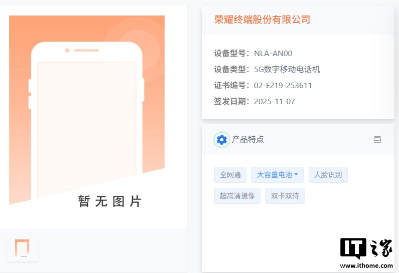 IT之家 11 月 29 日消息,一款型号为 NLA-AN00 荣耀新机近日现身电信设备终端网,预计为荣耀畅玩 60A,部分参数信息也随之曝光。