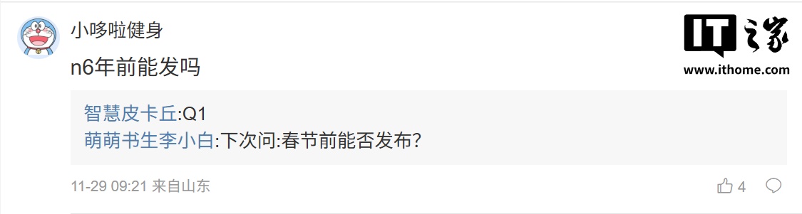 后续有用户在评论区询问:“n6 年前能发吗”,博主回复道:“Q1”;另一名用户则询问道:“X300U 主摄尺寸有木有缩水”,博主则回复道:“更加强大”;另外一名用户则询问:“耳夹今年会有吗”,博主表示:“历史遗留问题”。