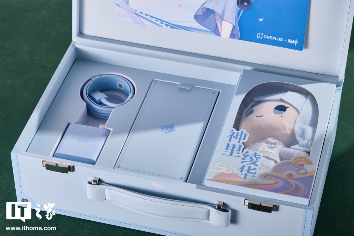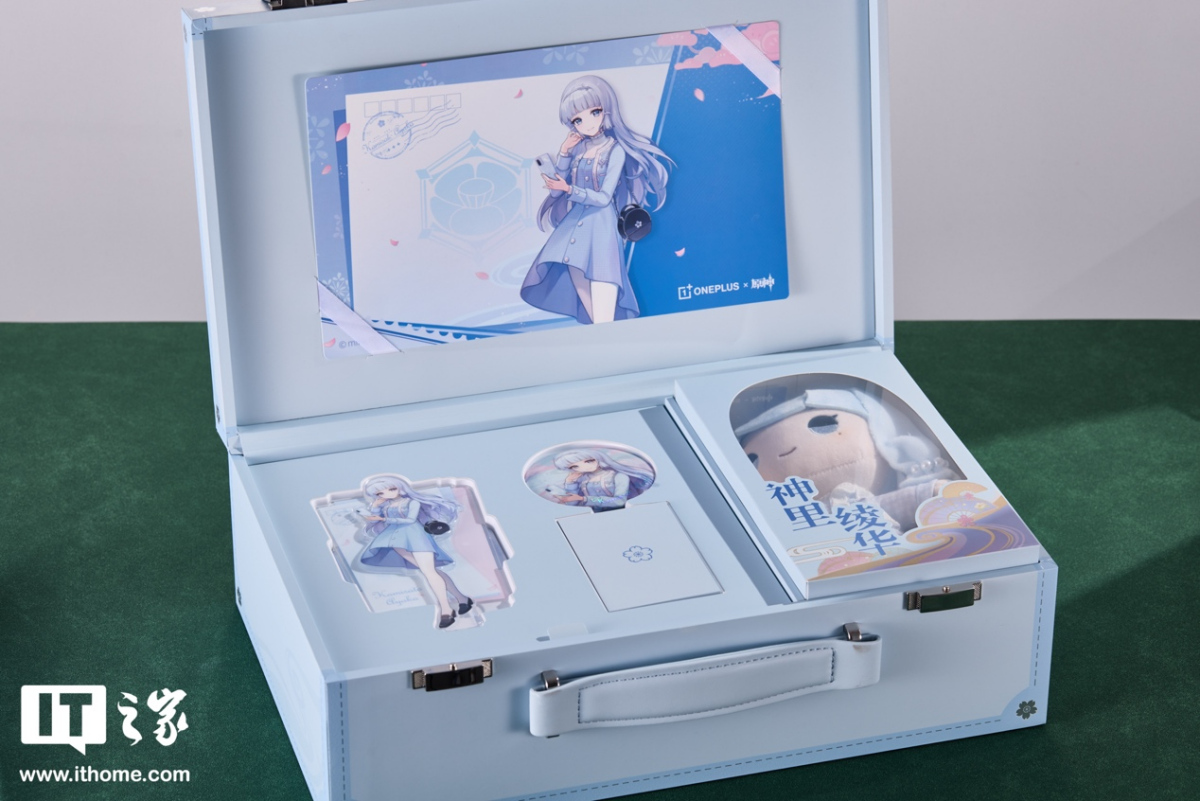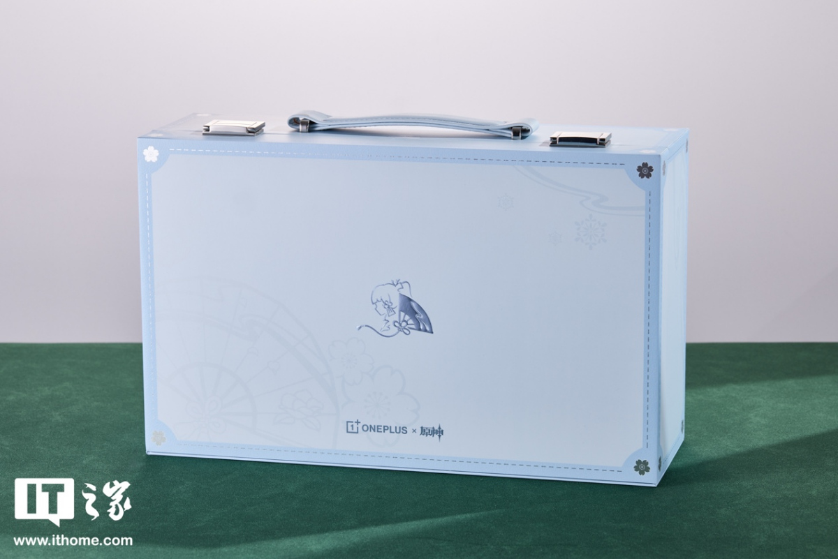 一加 Ace 6T 神里绫华定制机采用了手提箱造型设计的礼盒,正面印有绫华头像舞扇图案,底部还有一加 x 原神联动,配色非常小清新。包装顶部专门设计了皮制提手和金属扣具,开箱氛围感十足。
