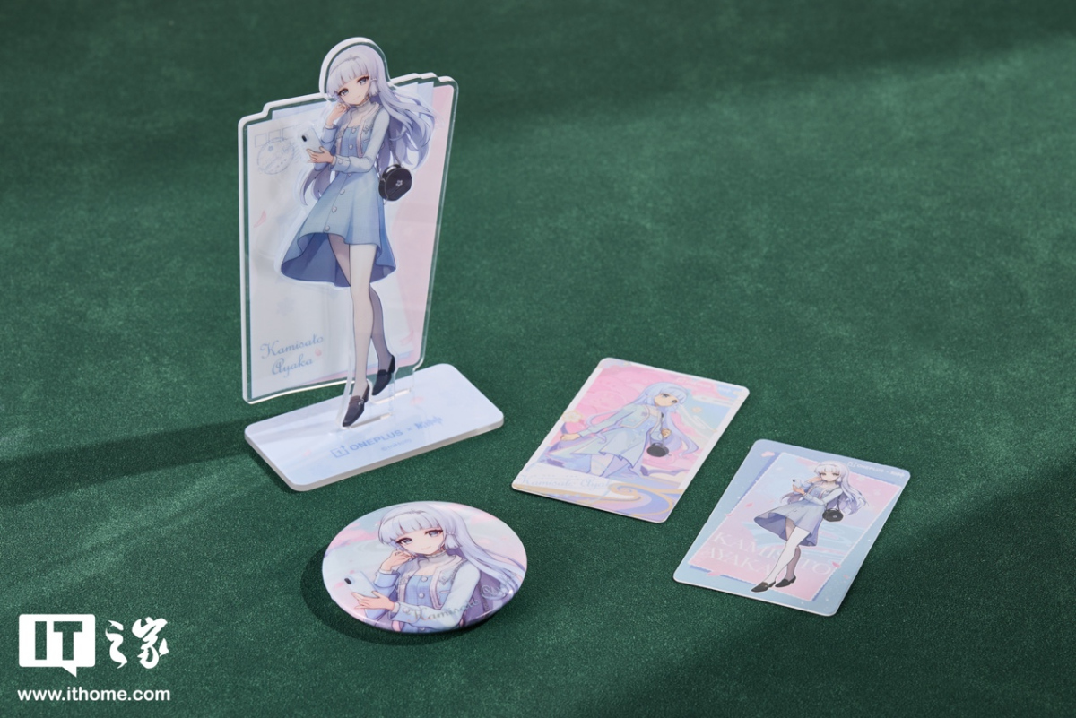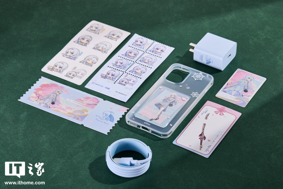 定制款 100W 超级闪充适配器和数据线为雪霁蓝主题色涂装,适配器表面印有绫华头像和舞扇元素。包装盒内附送的两套绫华 Q 版头像贴纸、定制纪念镭射票等周边,卡针则采用了神里绫华专武「雾切之回光」造型,还配有专属收纳卡。