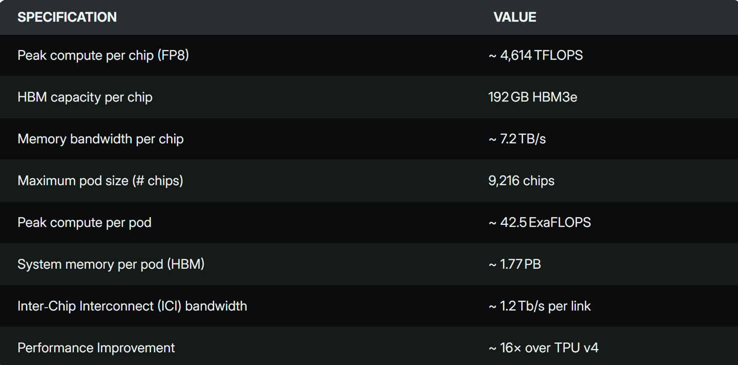 谷歌 TPU v7 采用了先进的双芯粒(Dual-Chiplet)设计,每个芯粒均配备了专为 AI 运算优化的核心单元。其中包括用于高效矩阵乘法运算的 TensorCore、处理通用计算的向量处理单元(VPU)以及专门优化稀疏数据处理的 SparseCores。