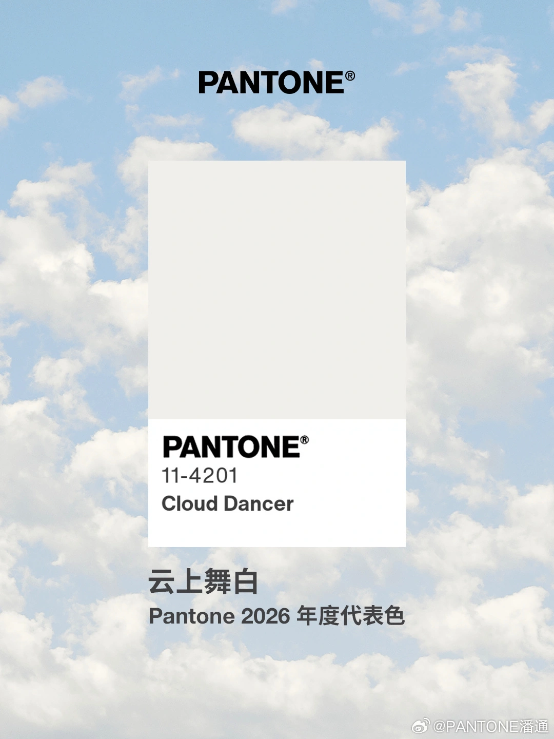 潘通(彩通)12 月 4 日公布了 Pantone 2026 年度代表色 —— PANTONE 11-4201 Cloud Dancer 云上舞白。
