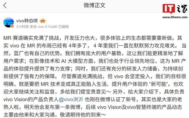 据IT之家今日早些时候报道,vivo通信科技有限公司产品经理韩伯啸发文称,MR很多体验上的生态都需要重新做,4年里一直在默默努力攻克难关,同时vivo会坚定投入,把MR技术变成真正能融入生活、提升用户体验。