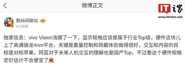 博主@数码闲聊站 今日发文透露,vivo Vision显示规格应该属于行业Top级,搭载高通骁龙4nm平台,重量控制和佩戴体验做得很好,交互和内容的目标是对标苹果。博主表示,vivo对于未来人机交互的理解也是国产Top,新头显的硬件规格也导致定价估计不会便宜。