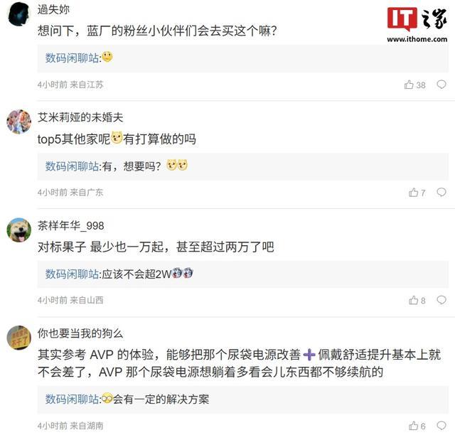 博主还在评论区回复了部分网友的问题:针对Top5其他家是否会推出头显,他表示“有,想要吗?”针对vivo Vision的定价是否会超过2万元,他回复“应该不会超过 2W”。