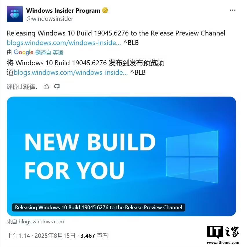 IT之家 8月15日消息,微软昨日(8月14日)发布博文,邀请Release Preview频道的Windows Insider项目成员,测试适用于Windows 10的KB5063842更新,用户安装后版本号升至Build 19045.6276。
